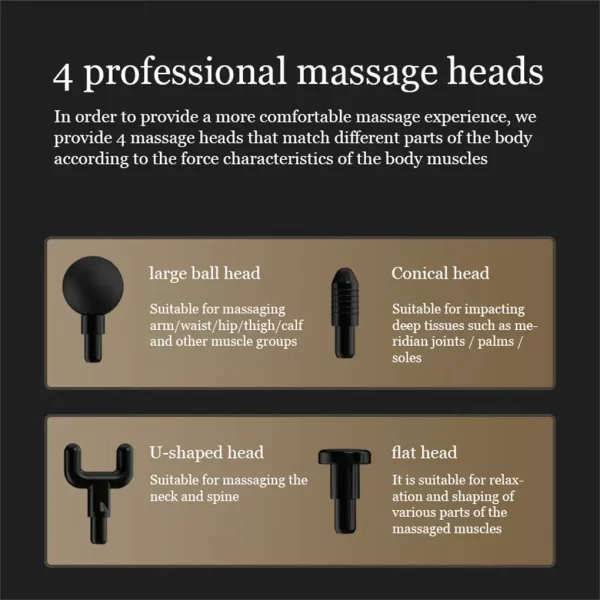 – 4-4 db cserélhető fej: A készlet különböző fejeket tartalmaz a tested minden részéhez a tökéletes masszázs érdekében. A gömbfej a nagyobb izomcsoportokhoz, a hegyes fej a mélyebb szövetekhez, a lapos fej az érzékeny, csontos területekhez, míg az U-alakú fej a gerinc melletti izmok masszírozására használandó.