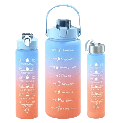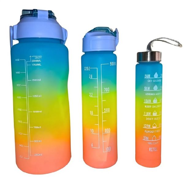 Aktuális termékünk kék és sárga színben pompázik, azonban webáruházunkban megtalálhatod még a rózsaszín és kék kombinációját is. A csomag 3 db motivációs kulacsot tartalmaz, amelyek erős műanyagból készültek cseppmentes kupakkal, erős zárszerkezettel és masszív fogantyúval. Az egyes kulacsok méretei a legnagyobbtól a legkisebbig (magasság és átmérő): 30×10,5 cm, 26×7 cm, 20,5×4,5 cm. A szett súlya megközelítőleg 500 gramm.