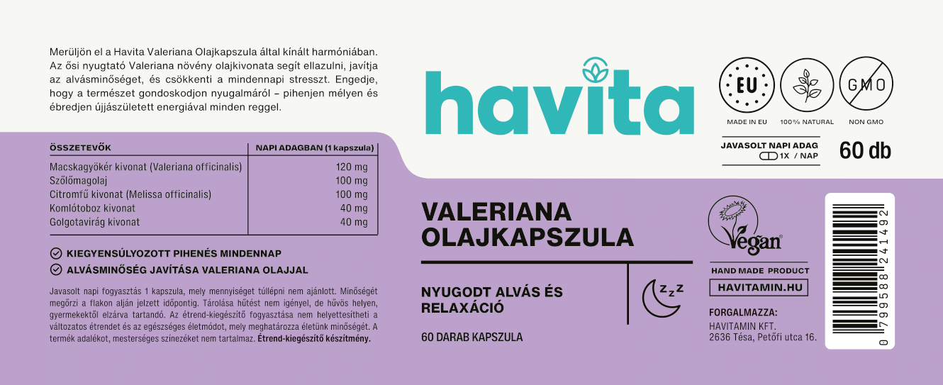 A HAVITA Valeriana Olajkapszula doboza 60 db kapszulát tartalmaz, 5 féle összetevővel és egyenként 400 mg hatóanyaggal.