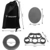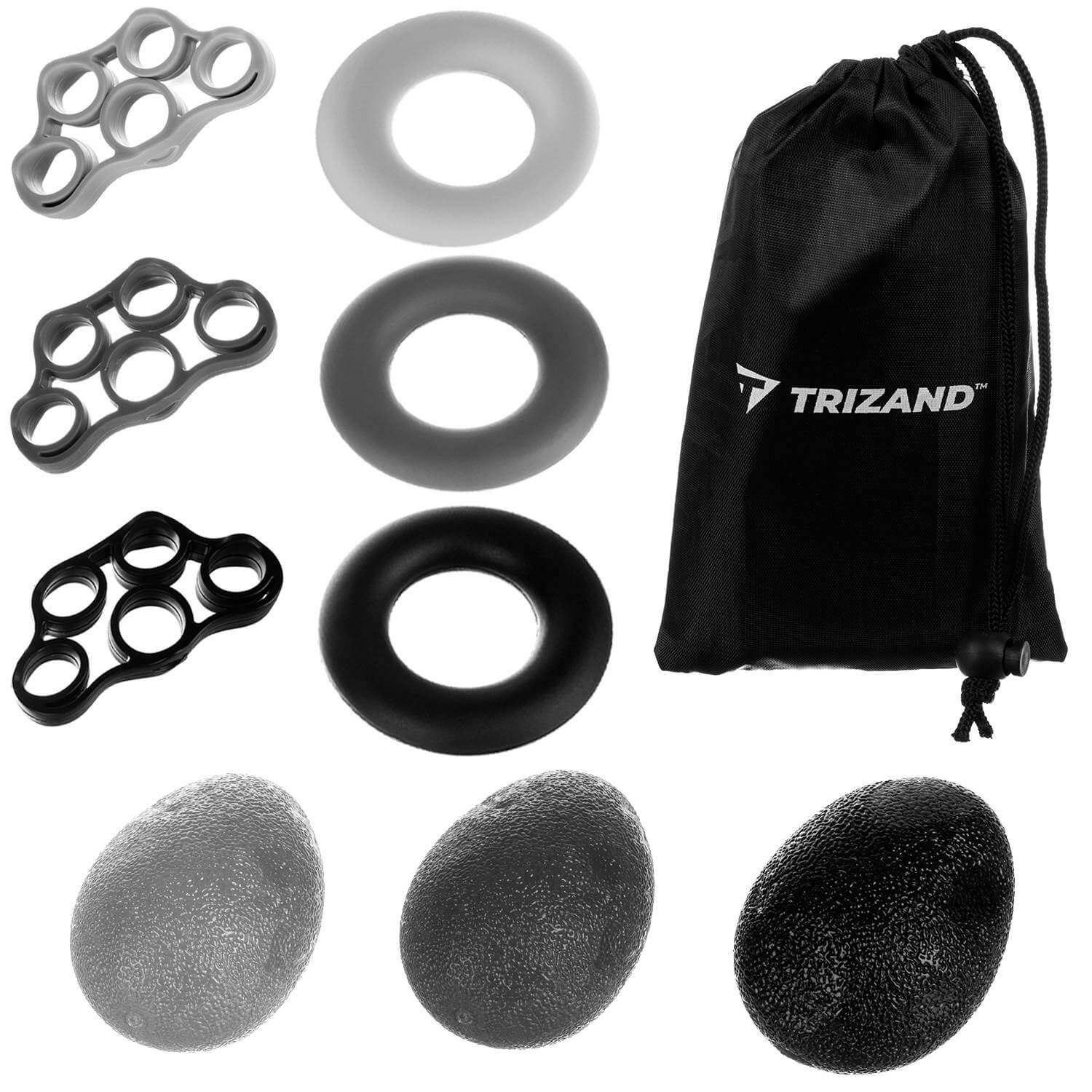 Univerzális készlet. A 9 darabos szett 3 gumiszalagból, 3 karikából és 3 zselés tojásból áll, amelyekkel számos kézizom gyakorlatot végezhetsz, egy vagy egyszerre több ujjal.